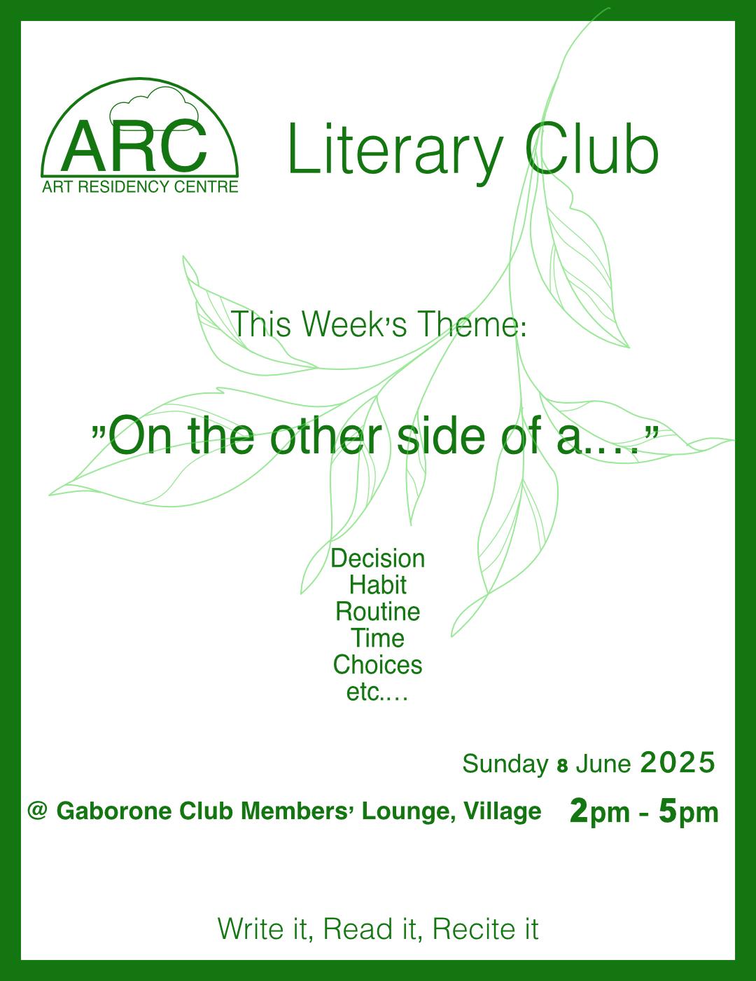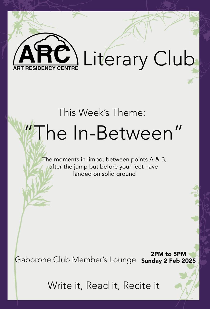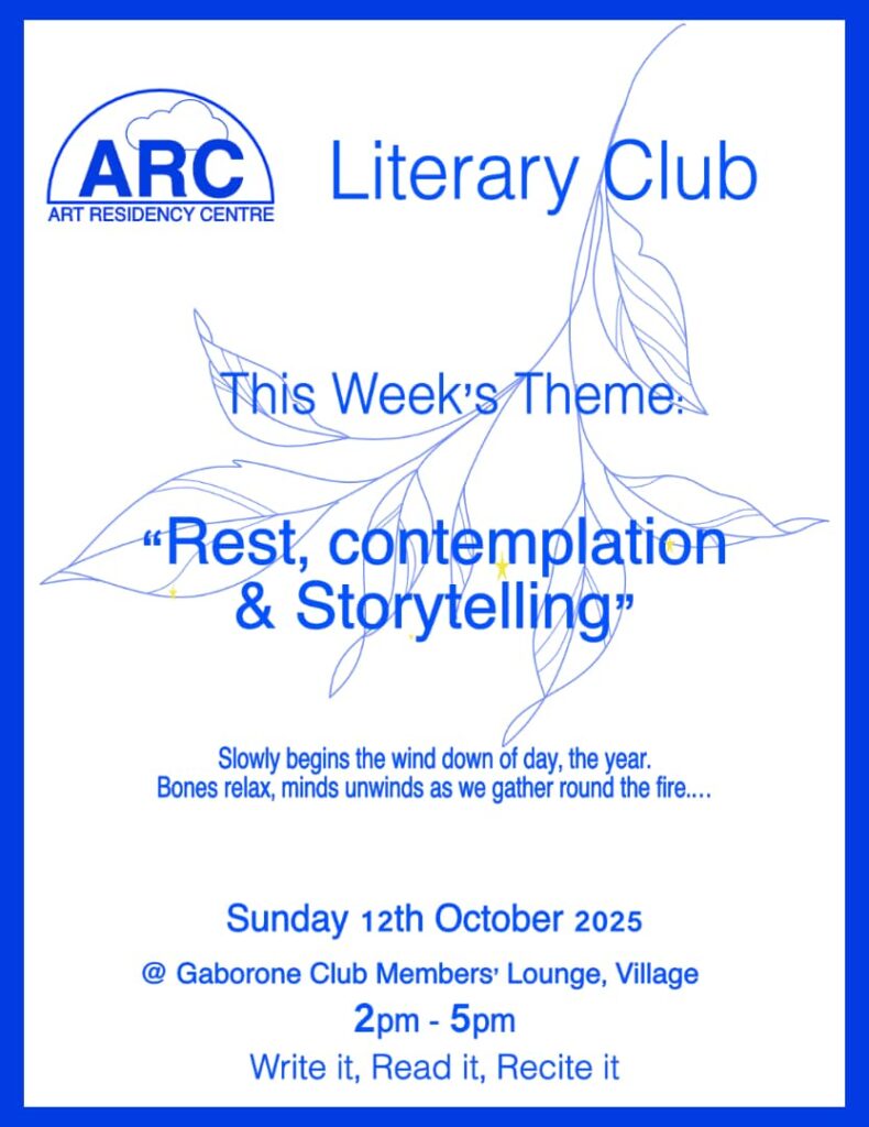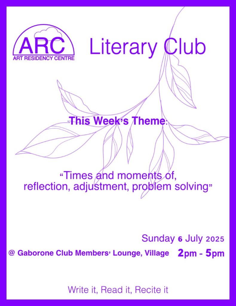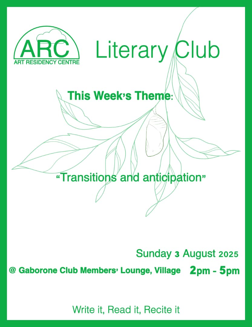 The Arc Reading Club is a group of poets, open mic performers, musicians, writers and visual/graphic artists who get together on an ad hoc basis to read to one another. We read our own poems, each other poems, international published writers as well as well as the words of unpublished local writers. Our oldest member, Professor Leloba Molema is 82 years old, retired from the University of Botswana, and the heartbeat of the group. We are diverse and inclusive and coordinate our meetings via a dedicated WhatsApp group that anyone can ask to join.